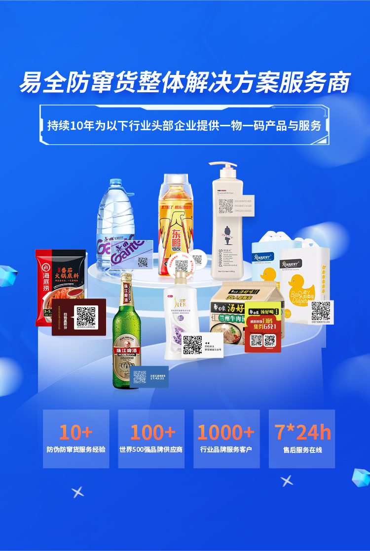 广州易全信息科技有限公司(EQ易全科技)拥有10余年的自主软硬件产品研发、系统集成、产线改造及市场服务经验,自主研发的系统包括:一物一码防窜货(IoT技术)、赋码&自动采集关联(三码/四码/五码采集关联合一)、防伪溯源、营销系统、WMS仓库管理系统等。这些系统运用于各行业,包括食品饮料、日化、酒类、母婴用品、医药、制造、服装等。